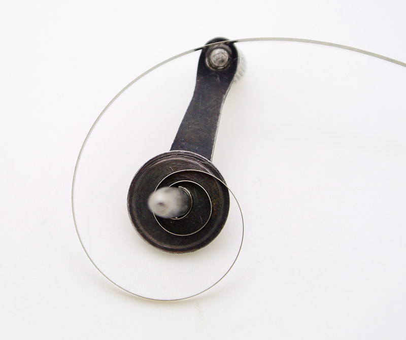 A degree of dexterity is required to wind in the spring, a steady even rotation required, with the tip of one’s left little finger keeping a slight pressure on the pusher at the end of the handle to ensure that the spring winds in flat. As we approach the end, we need to thread the bridle into the aperture to avoid bending it back on itself. The winding then continues until the last of the bridle finds itself inside the winder drum.