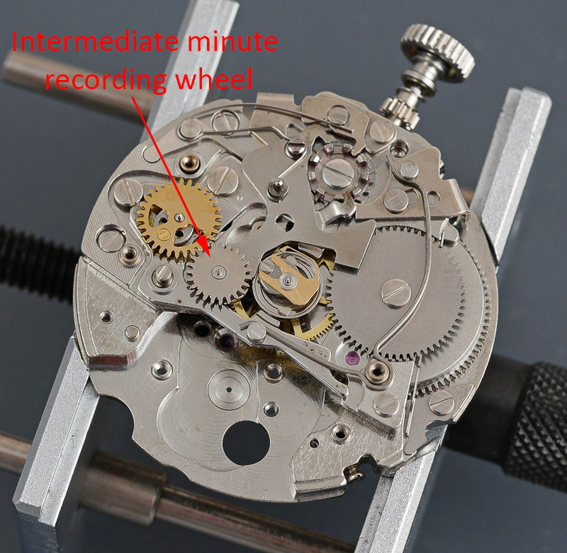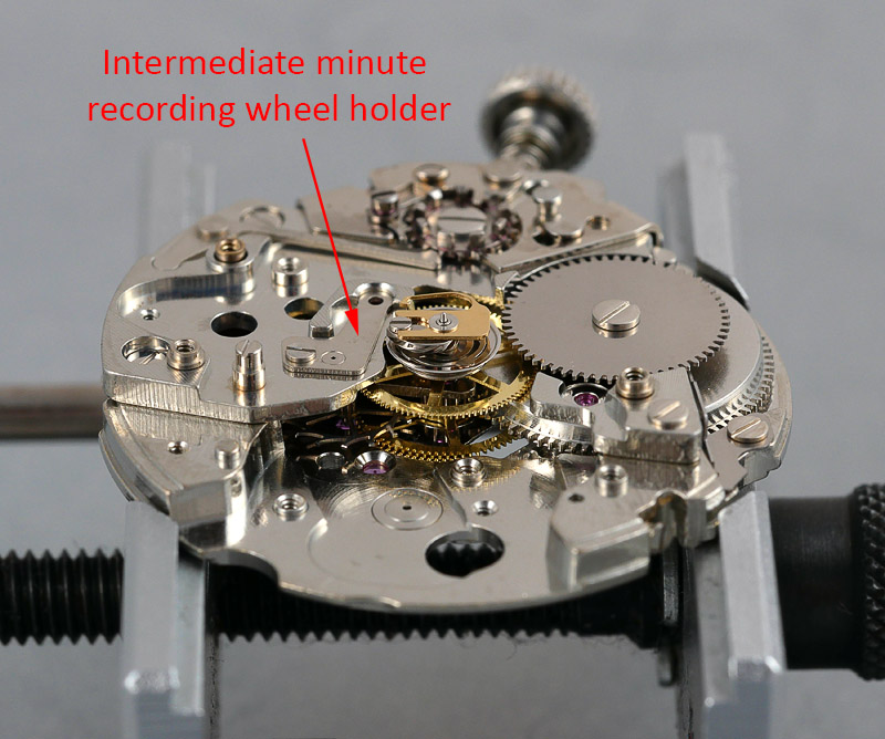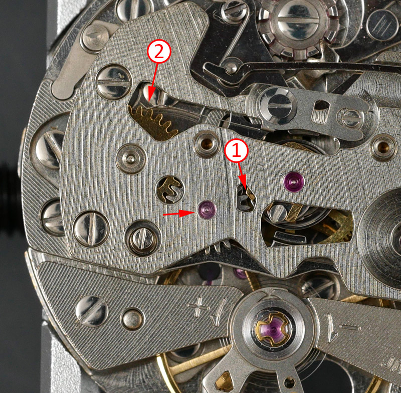 By a stroke of luck, the photo above captures the moment that the minute register ticks over. You should be able to see the chronograph finger making contact with one of the teeth of the intermediate minute recording wheel (1) and as the wheel turns, it simultaneous acts upon the minute recording wheel whose movement is regulated by the minute recording jumper at (2). With the new bridge in place, the movement is finally running as it should, with very good amplitude and displaying a flat timing curve and zero beat error.