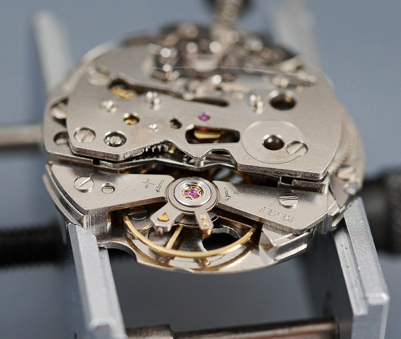 So let’s get stuck in. The first order of business is to remove the autowinder mechanism and mount the movement in the dedicated Seiko movement holder. The hour, minute and seconds hand come off in conventional fashion, but the minute register hand sits so close to the dial surface that the most prudent way to remove it is to gently lever up the dial from the movement until the hand pops off. With the day disk and date ring removed, the calendar side looks essentially the same as the 6106, barring the substitution of a couple of plastic parts.