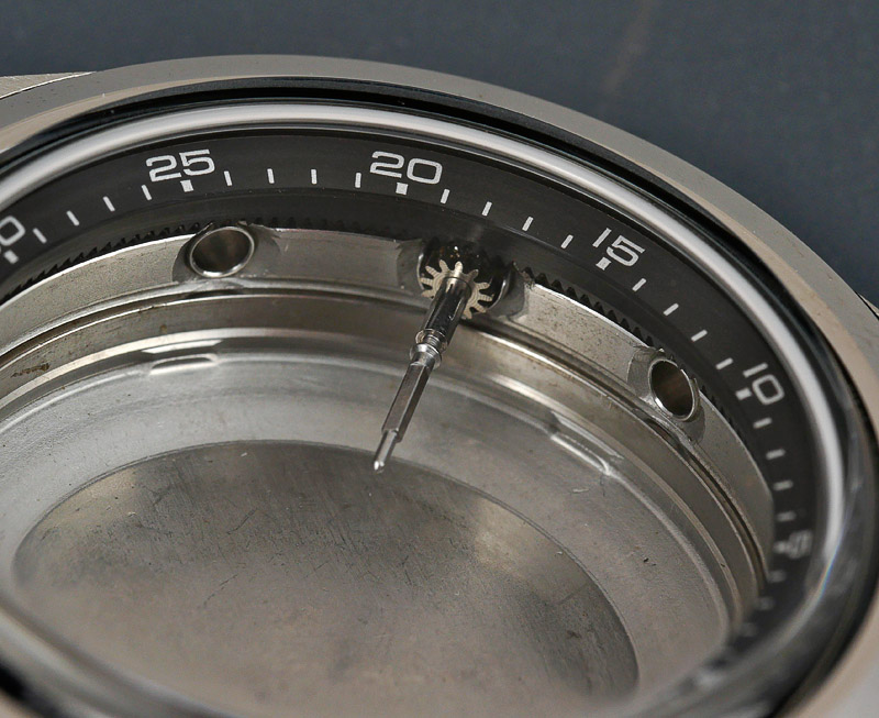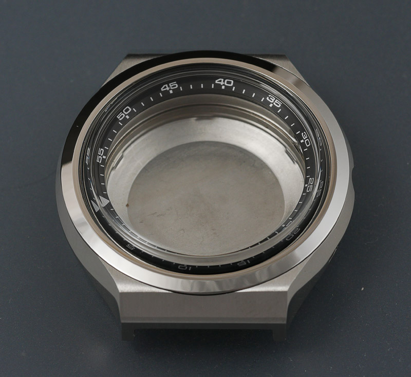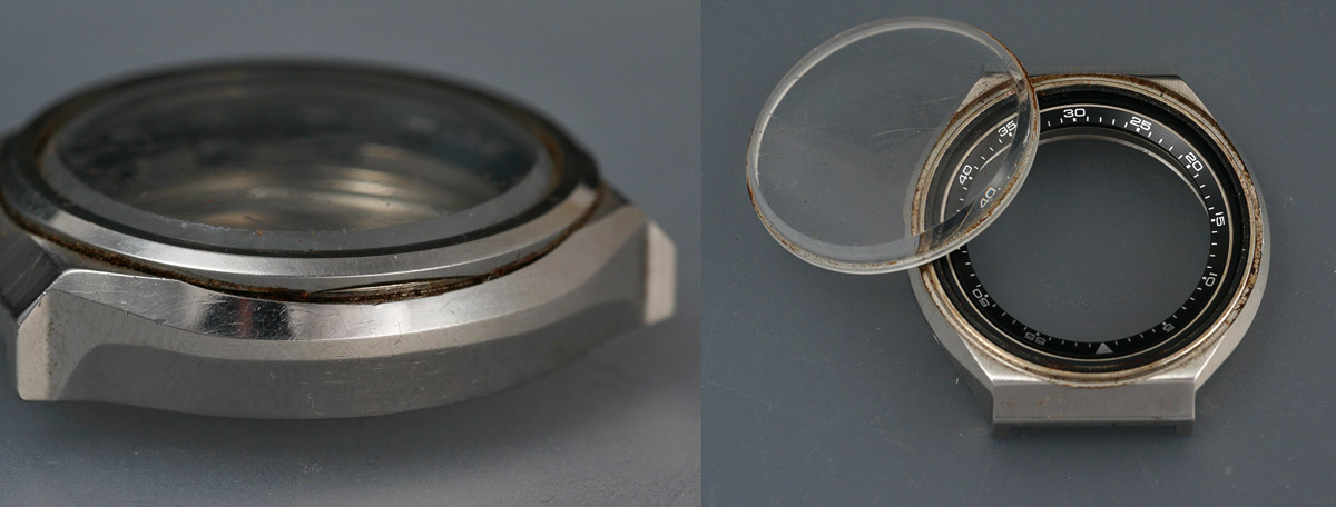 The inner parts of the old case can only be accessed by removing the bezel and crystal, aided by the helpful cutout on the bezel, positioned in this example to the left of the case.