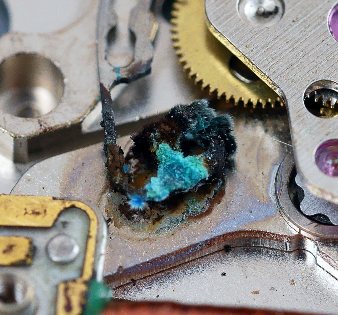 Time I think to take a closer look at the business side of the movement, and ascertain whether the problems extend beyond those due to careless handling. Looking closer in the region of the missing battery holding spring screw and things take a turn for the worse.