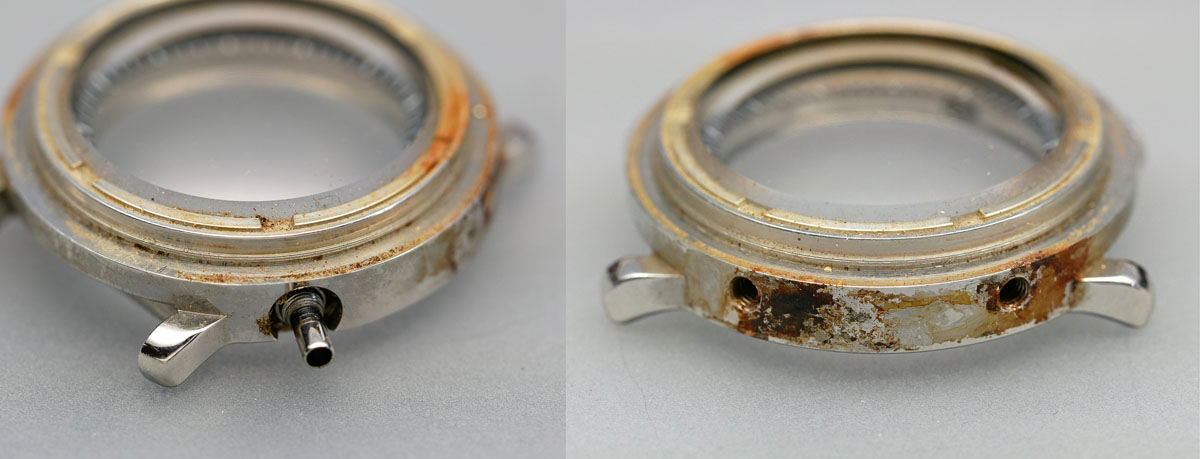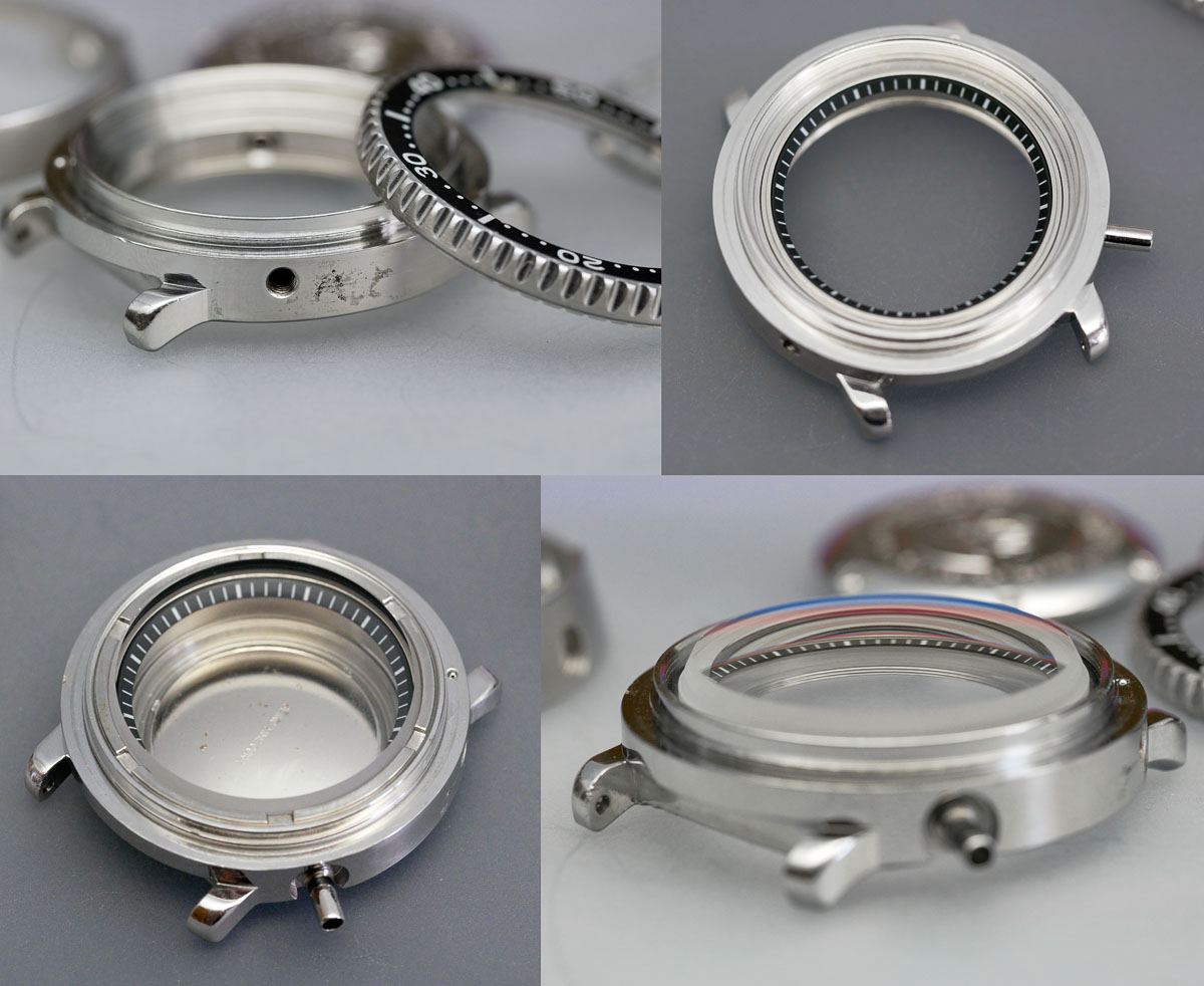Let’s take a break from the movement and turn our attention to the case, which, now shed of most of its fixtures, more fully reveals its imperfections.