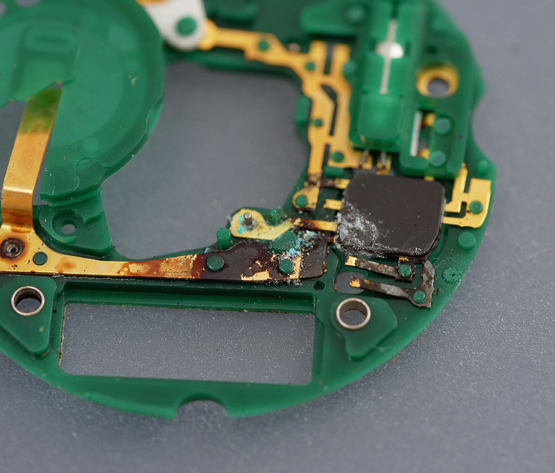 All becomes clear. What appears to have happened here is that battery electrolyte has leaked, pooled at the base of the battery compartment and then flowed along the path of least resistance, following the lines of the copper circuit connecting the battery negative terminal to the integrated circuit. The electrolyte is a conductor and having bridged the two sides of the circuit, we have a short. The integrated circuit burns out, further evidence of which can be seen in the state of end of the stop lever that will have been in the firing line directly beneath the IC.