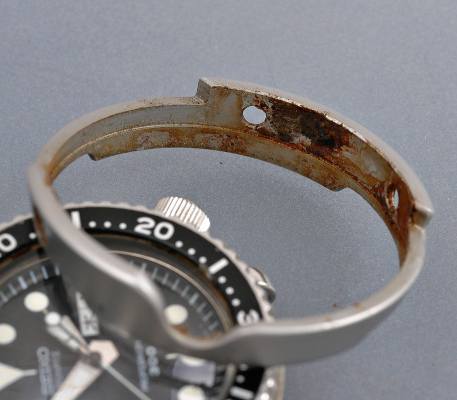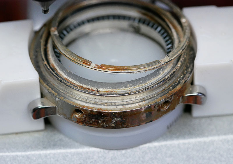 The corrosion looks somewhat unsightly, but should clean up nicely, with the actual damage to the case likely to be superficial. The 300m rating of the case owes much to the screw down crystal retaining ring, the removal of which is greatly facilitated by my case back opening tool.