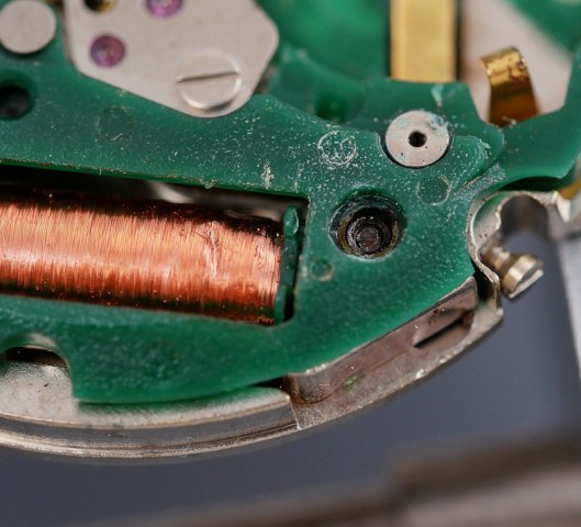It looks like we don’t actually have a missing screw – just a missing screw head. The thread itself looks still to be in position and its blackened state suggests that something else might be afoot. The close-up shot above also gives us a better view of the damage to the coil. Further insights into the sequence of events that appear to have befallen this movement require removal of the circuit block.