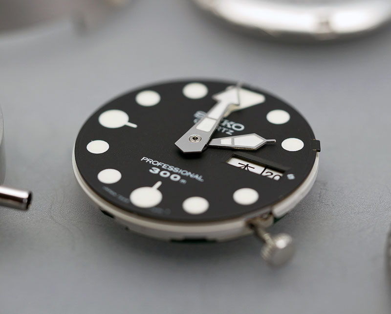 As we’ve covered the essentials of the 75 series quartz movement recently in the tale of the 7548-700B, I propose to skip most of the details in putting the movement back together, pausing only to note details such as the correct reporting of the jewel count in the marking on the circuit block.