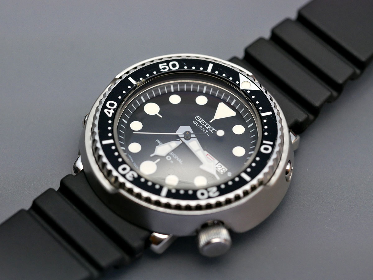 So in 1968, Seiko established a new project team who were tasked with producing a watch that was to be designed from the outset for saturation diving rather than simply an adaptation of an existing design (such as the approach adopted by Rolex in creating the Sea Dweller from the Submariner). The design brief was to produce a shock-resistant, corrosion proof, anti-magnetic watch with a case that was impermeable to helium gas. In 1975, after seven years of research and development, the first Seiko Professional 600 m diver’s watch emerged and the Tuna dynasty was born.