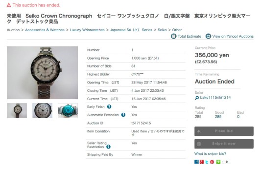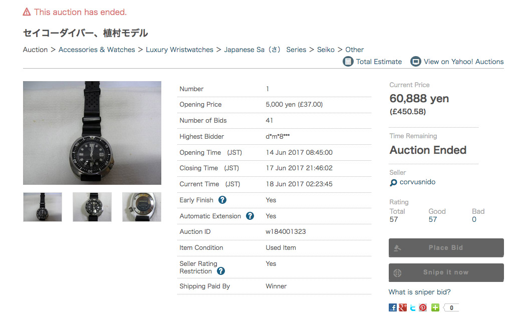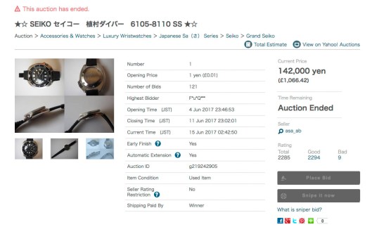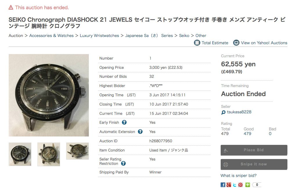 Still, 32 bidders and a final price of ¥62,555. This looks like a pretty keen price to me because the plastic bezel is worn and the pusher corroded, both of which, either nearly impossible to source (the bezel) or difficult (the pusher).