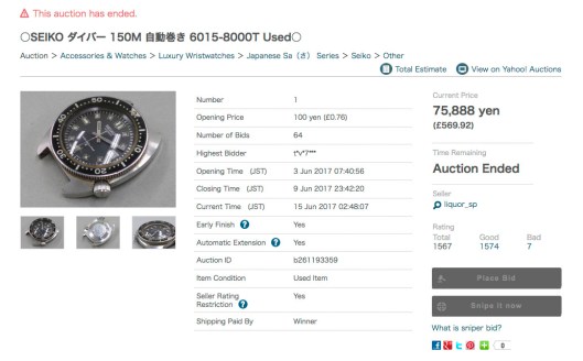So, let’s take a look at some recent completed auctions on Yahoo Japan, to get our eye in a little and see to what extent my impression is backed up by the reality of the market place.  Let’s start with that perennial favourite, a mid-1970’s Seiko 6105-8110.