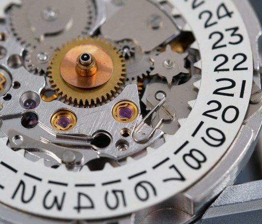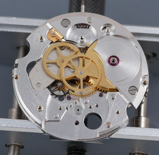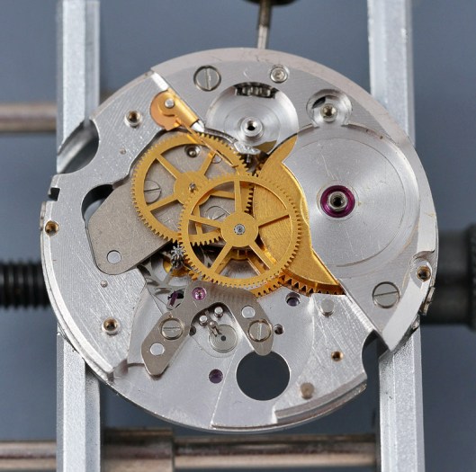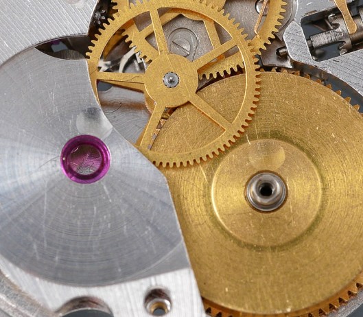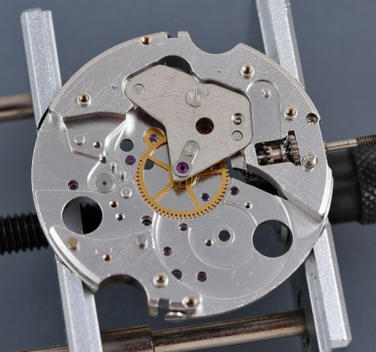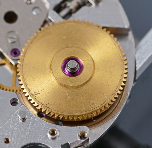Another design difference between this and the 62 series is in the hour wheel which uses a double-decker gear arrangement, the lower transferring motion to the date driving intermediate wheel and the upper deck receiving instruction from the upper pinion of the minute wheel.