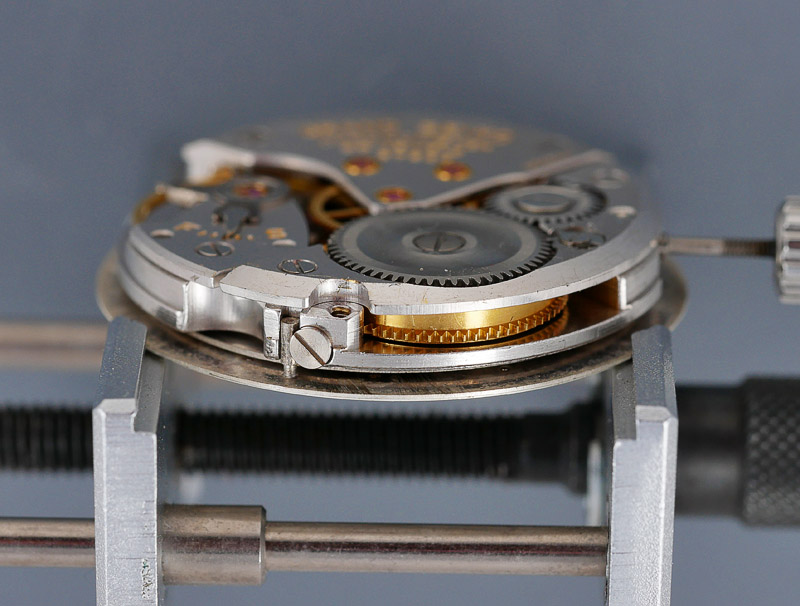 The Crown movement now had a numeric name, the 560, but just as the Marvel had evolved into the Lord Marvel, so the Crown’s 560 evolved to the Crown Special’s 341. Both of these larger hand-wound movements ran at 18000 bph, and featured Diashock shock protection and Diafix jeweling. The 341 boasted an additional 4 jewels more than the base 560, taking the jewel count to 23, and a second setting device (hacking). However, in moving from the smaller Marvel movement to the larger 560 and 341, the moveable stud on the balance wheel had been lost (see photo above).