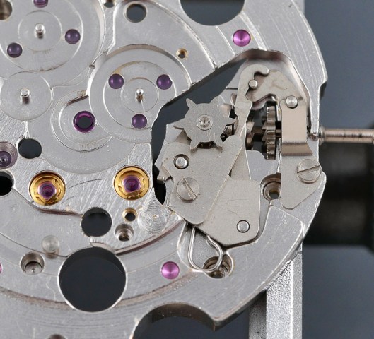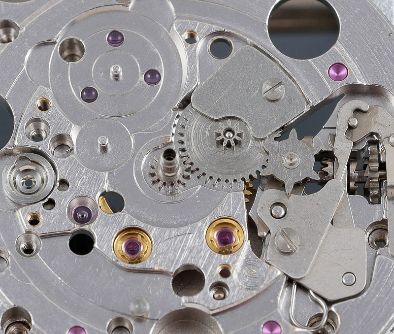 The main plate is festooned with no fewer than 11 jewels, there supposedly to facilitate passage of the date wheel (5 J), the minute wheel (3 J) and the date driving wheel (3 J). I have to say, I find this somewhat disappointing but I’ve made my views clear on gratuitous marketing-driven over-jeweling before, and I won’t over-egg the pudding on this occasion. Those of you of a faintly mathematical persuasion will have noticed that 35 minus 11 is 24 so somehow the basic movement has actually lost a net 1 jewel compared with the 3180. Rather than be too dismayed at this, we can note that that extra jewel was just a cap jewel serving the pallet fork bearing, which in any case is one which many (most?) watchmakers leave unlubricated.