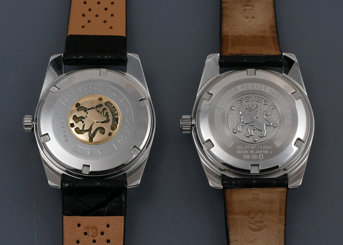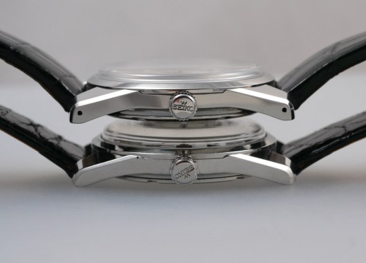 Ok, there does not appear to be a great deal of difference in the front-facing aspect of the cases, but the use of a box-domed sapphire in the SBGV009 where the 5722-9990 uses acrylic, has the optical effect of causing the dial to recede somewhat and appear a little smaller than it does in the older watch. This is not something to which I have any objection – it just creates a different look to the newer watch compared to the vintage.