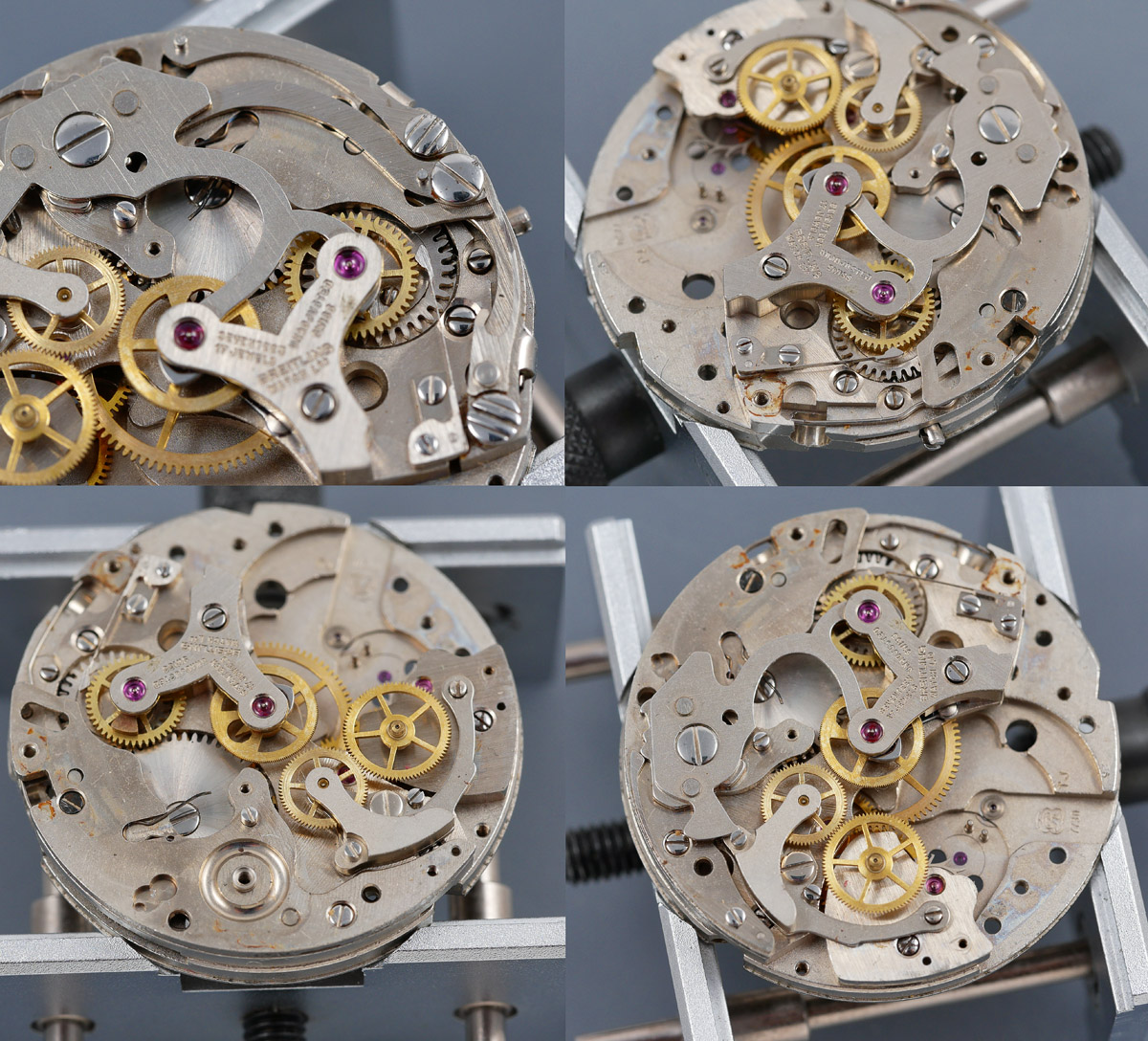 With the balance safely tucked away, we can start to disassemble the chronograph parts, starting with the start and reset cam levers and then removing the mounted hammer, exposing the sliding gear spring (sequence below, starting top left and then working around clockwise).