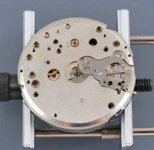 The waterproof case is a unibody design with the movement accessed through the crystal. With the watch in its current state though we do not need to worry about access issues because the crystal has long since flown the coop.