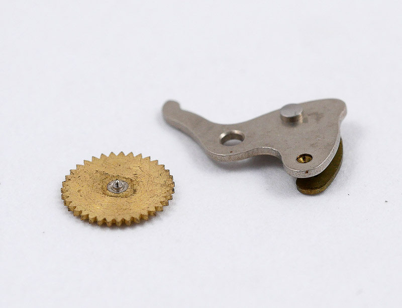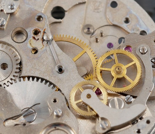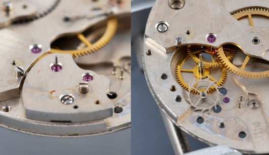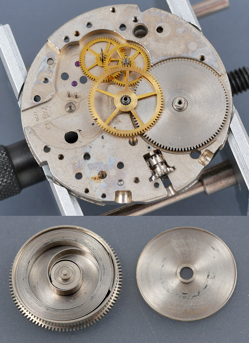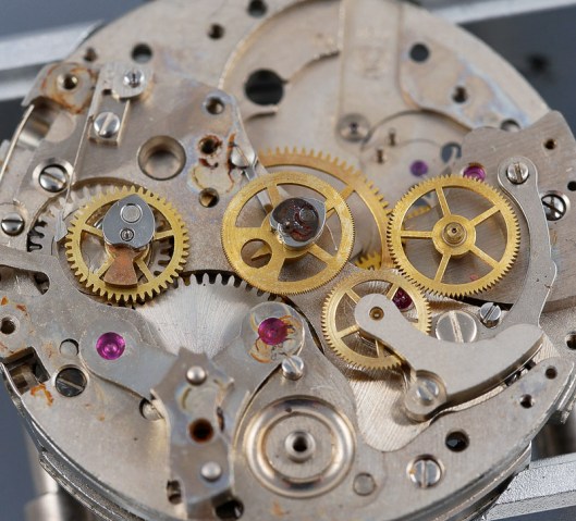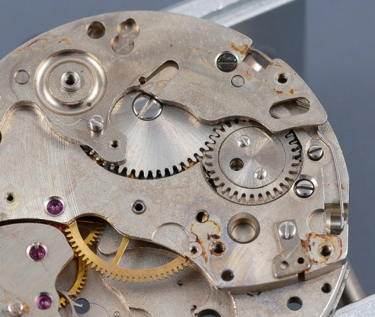 You might just be able to make out the movement model number beneath the balance wheel, which identifies this as a Valjoux 7730. The red arrows indicate two conspicuous vacancies: the lower, a missing coupling clutch spring and screw and the upper, the mounted sliding gear and its screw. The latter was knocking about in the plastic box in which the watch came but the axle was sheared on one side of the wheel and the two parts separated.