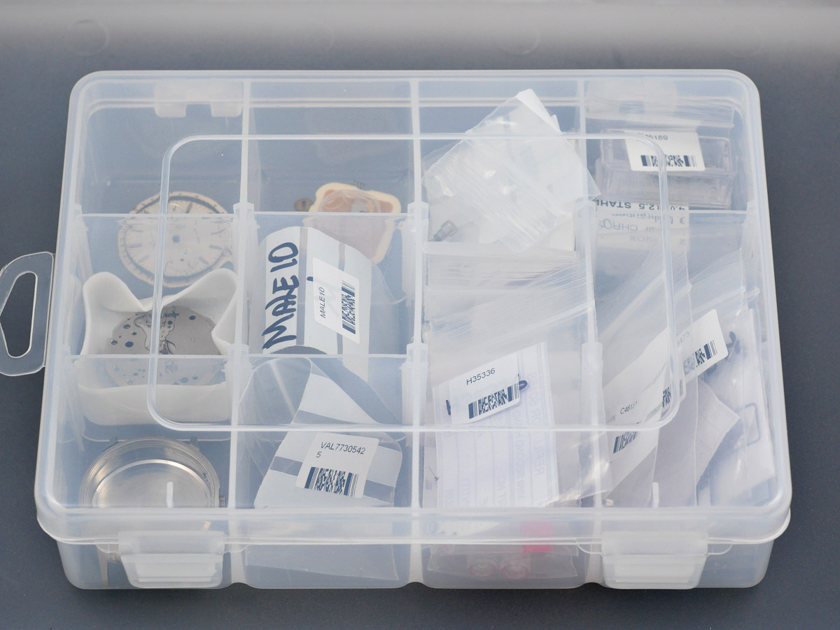 At this point in proceedings, I needed to get a sense of the viability of this as a project that was going to lead somewhere. The missing movement parts (that I knew about up to this point) I was able to source reasonably easily at modest expense but the casing parts would need some research. Several weeks of endeavor led me to the conclusion that I was not going to be able to find the hands or crown or pusher or movement retaining ring and so I would need to find suitable substitutes. The most costly of these were the pushers, the expense the result of a couple of false starts in getting parts that conformed to the measurements I had taken. I don’t propose to take you through the gory details at this point though – we can do that at the appropriate time – so for the moment, let’s survey the box of bits that I have accumulated up to the point that resolve has tipped into action and I find myself making a start.