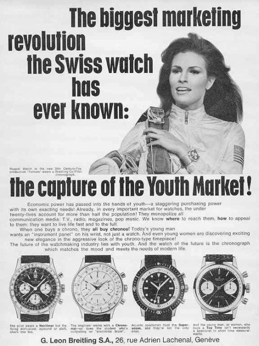 In constructing their marketing strategy for the newly optimistic 1960’s, Breitling struck upon the idea of targeting the “staggering purchasing power of the youth market”. “Today’s young man wants an instrument panel on his wrist, not just a watch” and “even young women are discovering exciting new elegance in the aggressive look of the chrono-type timepiece”.
