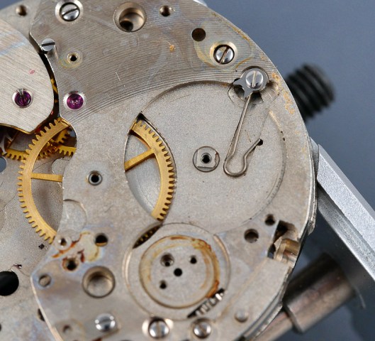 The cam on the top of the chronograph runner has clearly suffered from the same exposure to the moisture that has affected the dial. I had wondered if the gathering oxidation had caused the arm of the bridge to bend up slightly but the chronograph runner sits on a tension spring and so that seems implausible. As usual, perhaps the bent bridge is the work of a watchmaker looking for a lazy means to adjust the vertical position of the runner. Whatever the reason, I made a note to straighten things out later on when the movement comes back together.