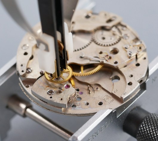With the chronograph plate removed, followed swiftly by the crown wheel and ratchet wheels, we get a nice view of the click spring and click.