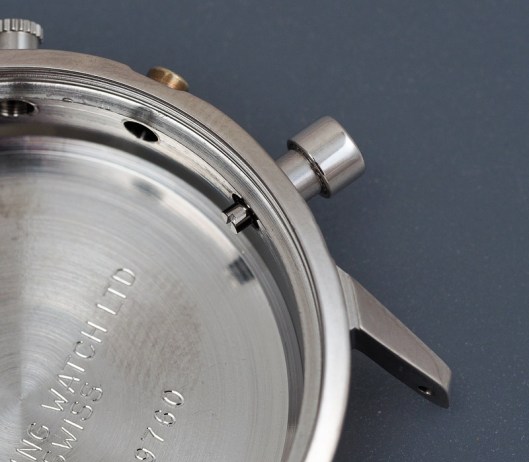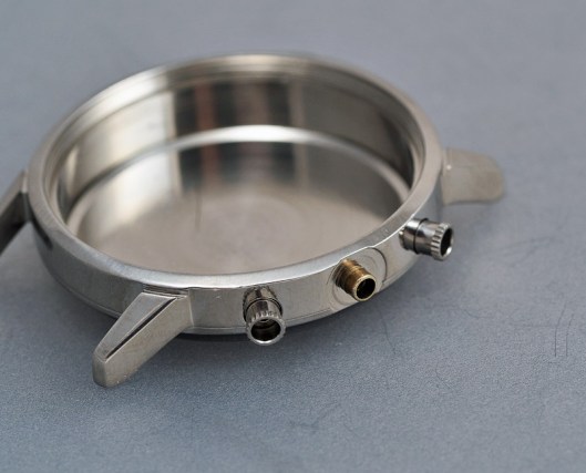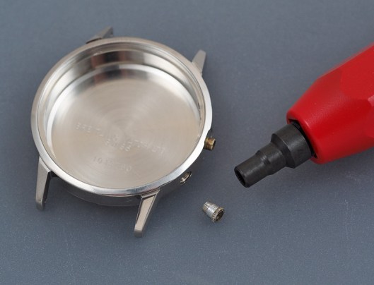 Let’s start with the pushers. Given that we have one working original pusher but that a generic substitute is likely not to have exactly the same dimensions, my first decision was to replace both pushers to avoid ending up with a mismatched pair. With that decision made, the next head-scratcher for the uninitiated (i.e. me) involved ascertaining how the pusher pendant tube should be removed. The inner components are dismantled easily enough by unscrewing the threaded pusher from the inside of the case. The cap, its spring and the pusher can then be set to one side and attention turned to the pendant tube. With this design of case, the pendant tube is screwed into the case, its splined head aiding its fitting and removal. One word of caution: under no circumstances must you attempt to remove such a tube using anything other than the correct tool. If, for example, you attempt to unscrew it using a pair of pliers, you will almost certainly crush the tube, rendering it un-re-usable. Instead, purchase the correct tool and rejoice in your foresight as the tube is liberated from the case without so much as a whimper.