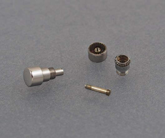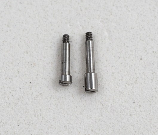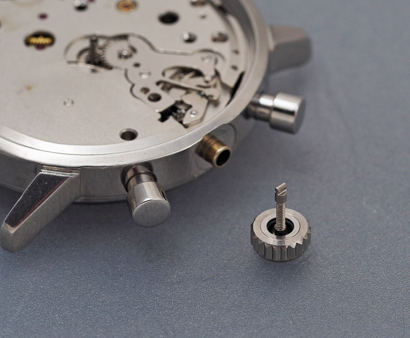 The original pushers have a 4mm cap and use a 2.5mm pendant thread and so this is what I ordered from Cousins. These pushers are not cheap and so it is best to be certain of your measurements before placing your order. Here is one of the two new pusher assemblies next to the outgoing original.