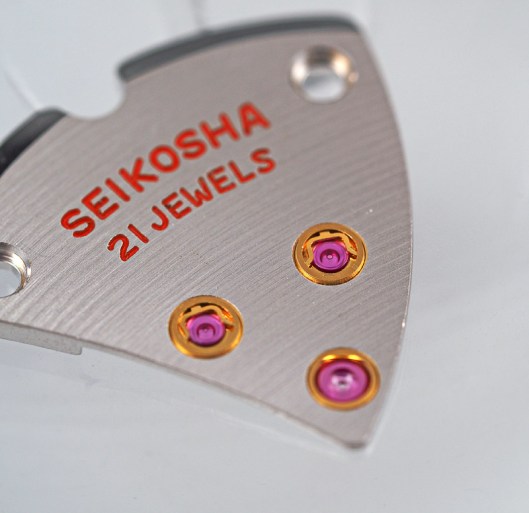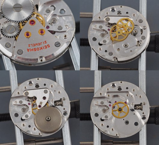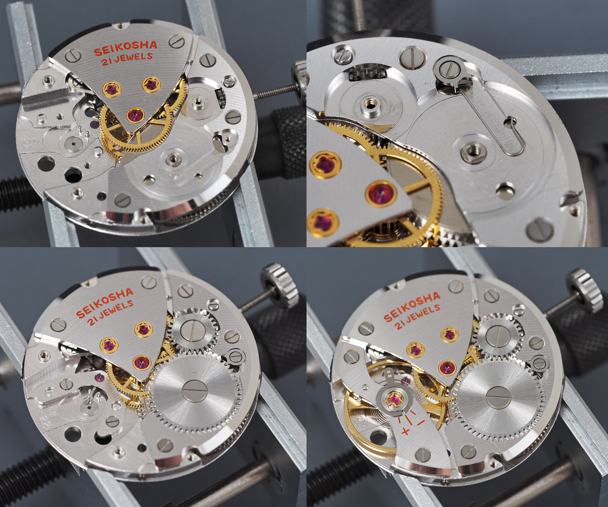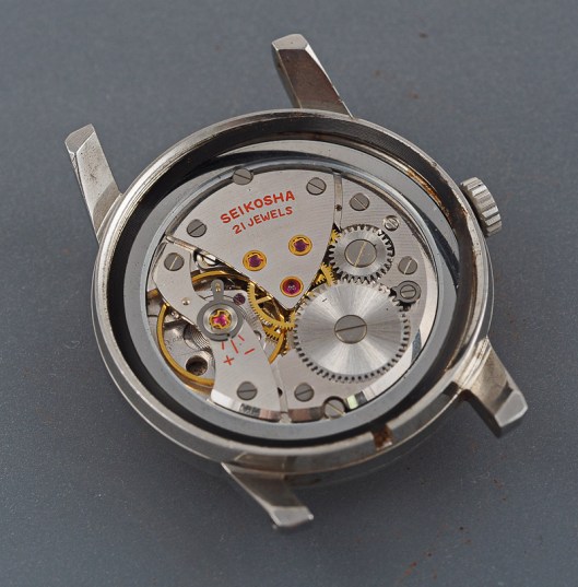 We are greeted by the 21 jewel Seikosha Cronos movement, whose defining feature is the lovely sine wave curve of the balance cock, supported at both ends. We can also note at this point the two Diafix settings serving the escape and third wheels. You will notice the presence of a rather beefy case ring too, with the flat gasket sitting between the outer edge of the ring and the inner edge of the mid case. Removing the movement requires the crown and stem to be removed, followed by the gasket, which would otherwise continue to hold the movement in position. We need therefore to lever out the old gasket first before tipping out the movement.