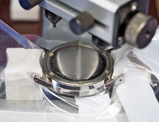 The first signs that this is a watch for which some time has passed since it last saw the attentions of a watchmaker presented themselves when I attempted to gain access to the movement. The construction here is two-part: the case back itself is clamped into position against the mating gasket by a separate ring. While such a design has a certain appeal, it does provide a greater number of surfaces vulnerable to the potential ravages of corrosion. My attempts to unscrew the ring manually were met with complete intransigence: it would not budge. Time to call into service my industrial case back opener designed to conquer even the most stubborn of over-tightened or seized case backs.