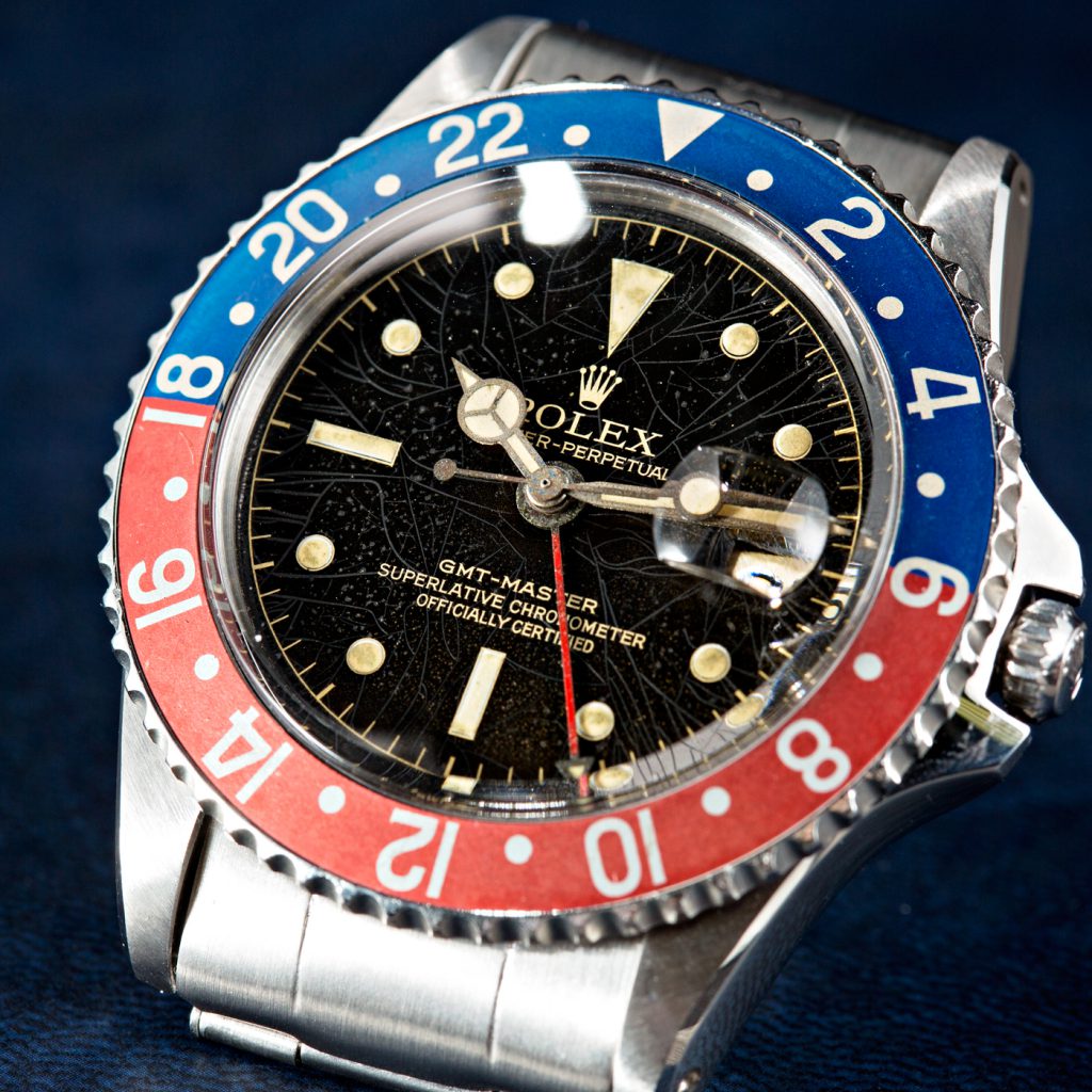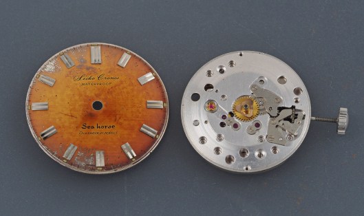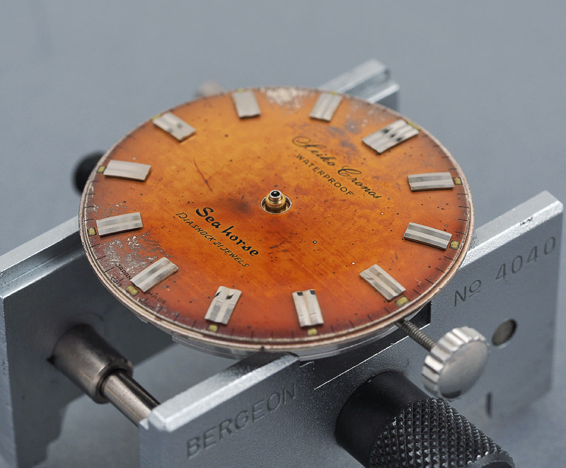 Dials age in all sorts of weird and wonderful ways, some of which deriving from unintentional flaws in their manufacture, and others from straightforward combinations of the effects of light, humidity and oxidation.   The original lacquer applied to protect the surface of a dial can crack into a spider-web network or degrade into a crystalline dusting of twinkles. The effects of sunlight and humidity, particularly prevalent in the tropics, result in silver or black dials transforming into increasingly rich variations of chocolate brown. In keeping with the aesthetic philosophy of the Japanese wabi-sabi, such imperfections or flaws are frequently treasured and in some cases can serve to actively enhance the value of a vintage watch.