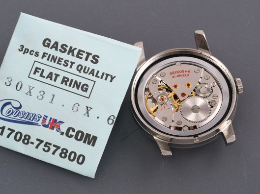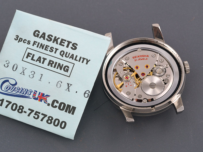 Without knowing or having a means to identify the correct part number for the case back gasket, I made some measurements and bought a couple of slightly differently sized generic gaskets from Cousins. The best fit identified, the gasket greased and fitted and we are one step away from completion.