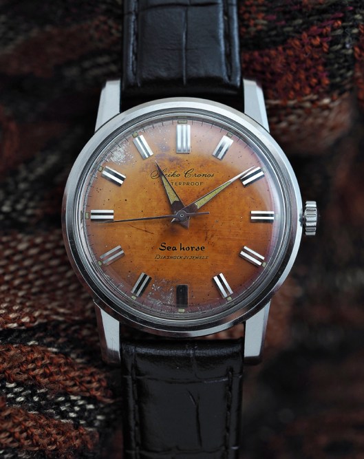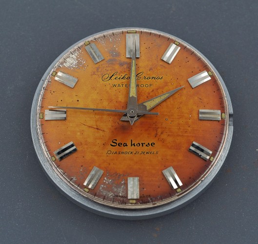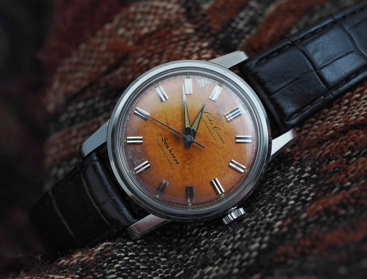 All of these outward signs of the passage of time can be viewed in some sense as badges of authenticity, but only to the extent that their appearance cannot be conceived as having resulted from any kind of artificial inducement. The present post is not concerned at all with the inducement of patina, but is instead inspired by the unquestionable enhancement in character and beauty that only authentically acquired patina can impart.  This brings us to our subject: one Seiko Cronos Sea horse J13032 from July 1961. Regular readers may recall in a long-winded preamble to a post about the Seiko Silver Wave, reference being made to the first fully fledged waterproof Seiko watch in the form of the 1959 Cronos Sea horse.