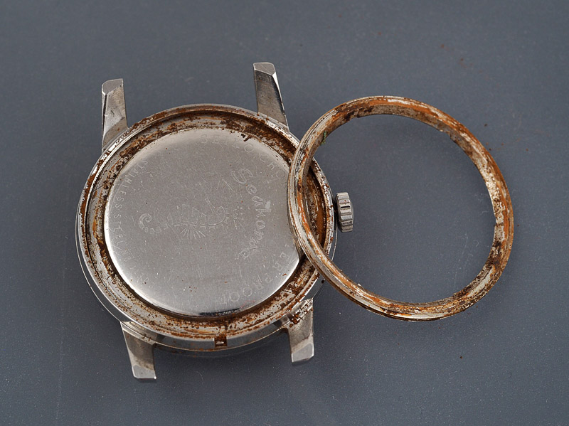 I let the watch run for a while at this point and turned my attention to the case. I spent some time removing as much of the corrosion by hand as I could before following my usual cleaning routine. This resulted in a satisfactorily clean case, ready for the installation of a new crystal.