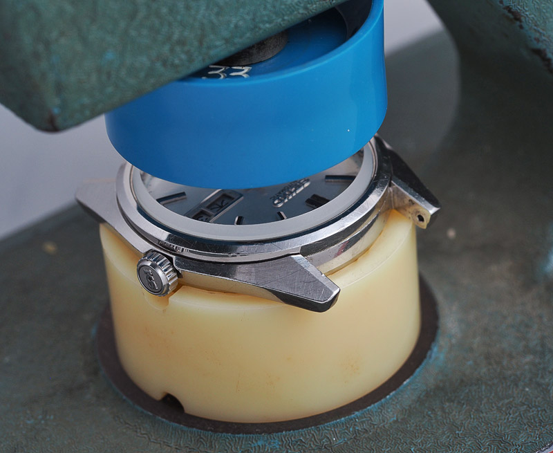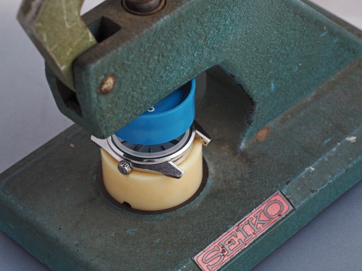 You can certainly see the effect of that frosted bevel from this perspective. I am not yet sure whether this is a good choice though – that will have to wait until the bezel is fitted and so that comes next. In order to fit the bezel, I elect to christen a massive new acquisition – a Seiko S-220 crystal and case back press. What a beast!