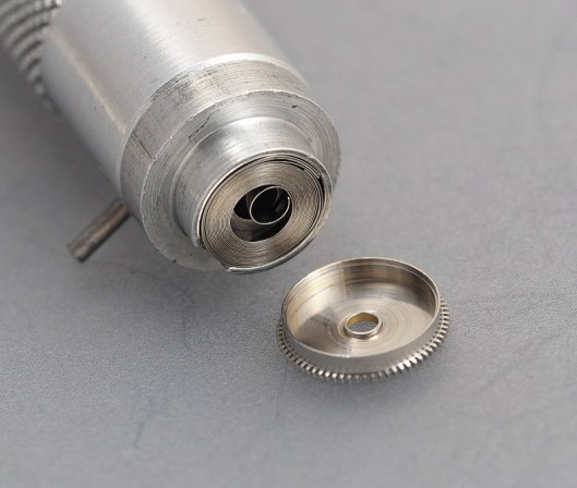 Before proceeding any further, we have to reunite the mainspring with its barrel.