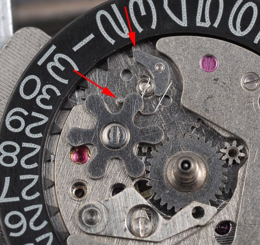We’ve seen this design before in the Grand Seiko 5722 but in that case the connection to the date driving wheel was via an intermediate wheel.