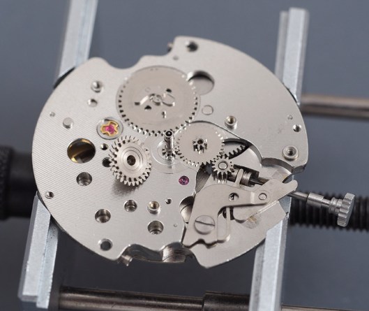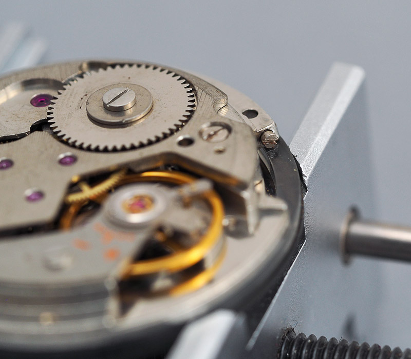 The proclamation on the dial that this is a 21 jewel movement suggests that one or more Diafix settings might lurk within but that proclamation flatters to deceive. If you’ve been paying attention, you will have noticed that there are three dummy jewels located on the date dial guard and so in reality this is a movement with 18 functional jewels. The additional jewel over the 17 jewel 6601 derives from the jeweled bearing serving the sweep seconds wheel in the barrel bridge. In the absence of any Diafix settings, the process of piecing this one back together is entirely routine. We begin with the keyless works, centre wheel, its bridge and the cannon pinion.
