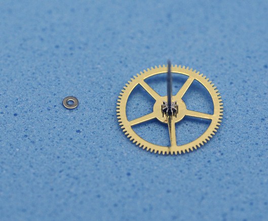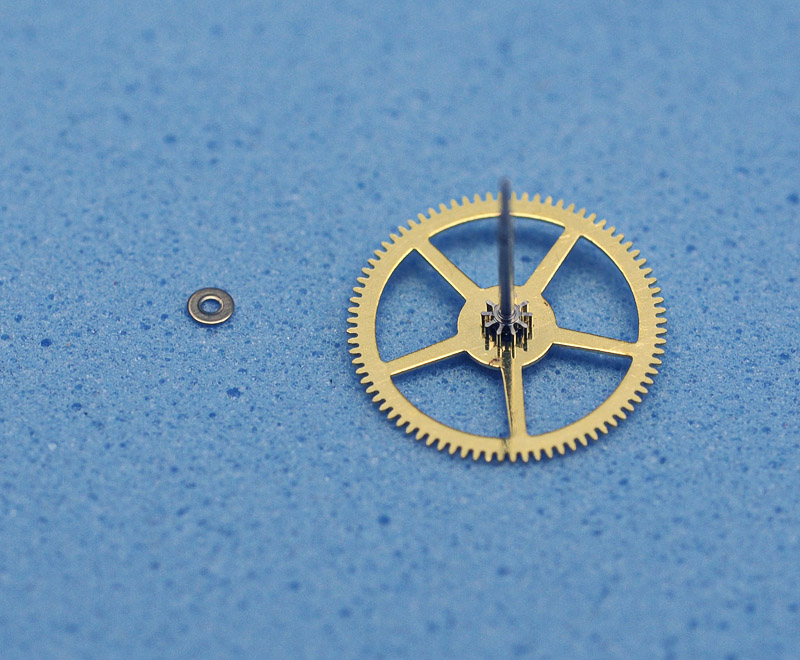 It is something of a mystery to me that this very small part has not absented itself in the 51 years since it was originally installed but nevertheless, there it is. The washer needs to be positioned over the hole in the centre wheel bridge before locating the sweep seconds wheel.
