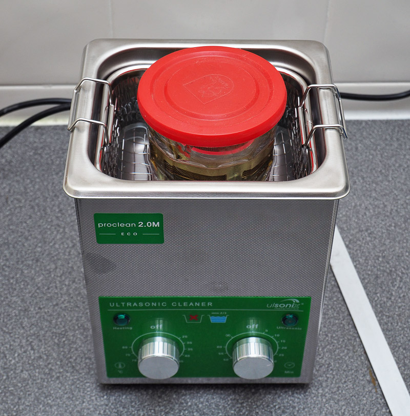 The whole assembly then goes into a glass jar filled with L&R ammoniated watch cleaning solution for a 15 minute session in the ultrasonic bath.