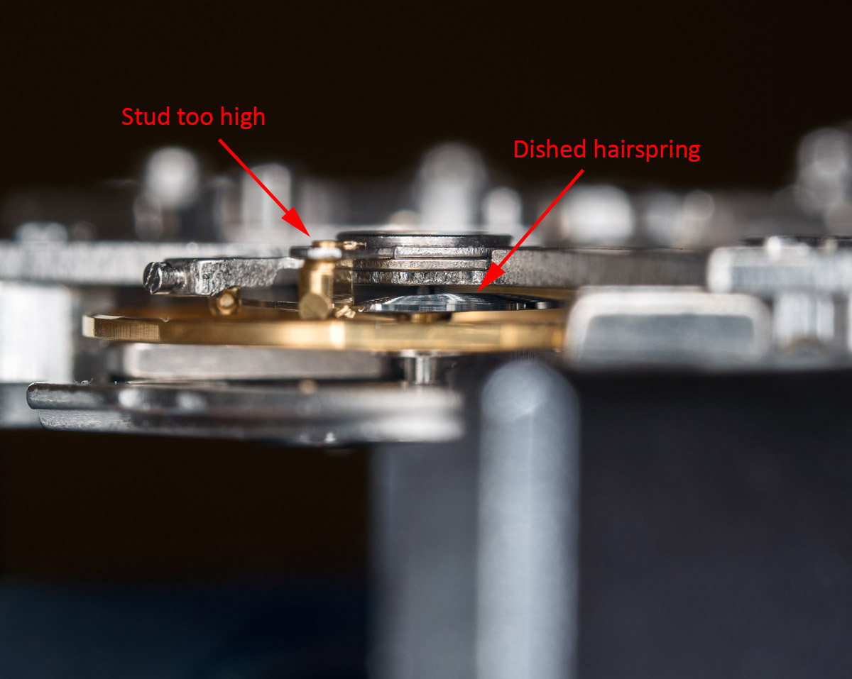 In the photo above, you should be able to see that with the stud holder and regulator arm appropriately oriented, the impulse jewel on the 6106 balance (right) is aligned 90 degrees anticlockwise relative to that on the 6139B balance wheel. When transplanting from one to the other, the hairspring collar needs to be rotated 90 degrees to properly align the impulse jewel so that it sits correctly between ends of the pallet fork. I should note that the balance on the right is a junk spare called into service for the purpose of illustrating my point and is not the balance transplanted to the 6139. With the replacement balance fitted, we can get a sense of how easy it is to get things wrong if not paying proper attention. In the photo below, the stud is sitting too high in the stud holder which is causing the hairspring to dish upwards, preventing it from sitting flat.