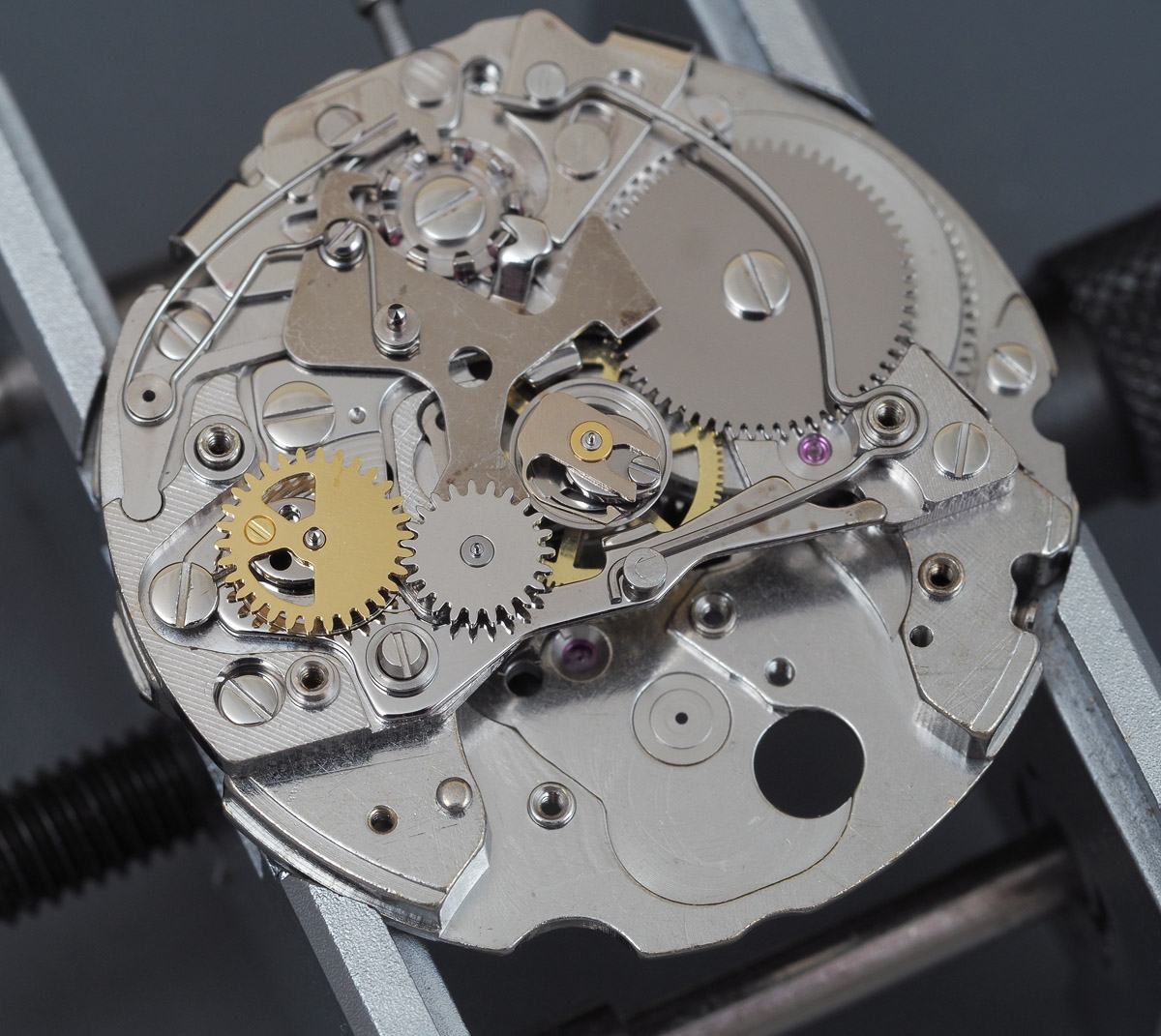 My efforts to track down the problem were fraught and required perhaps 6 or 7 rebuilding and dismantling cycles involving the replacement, one at a time, of the: train wheel bridge (one or two of whose jewels were slightly chipped); the chronograph bridge (ditto); the third wheel and finally the escape wheel.