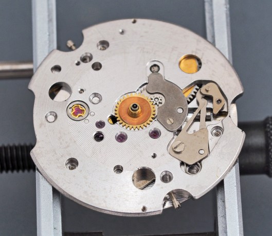 Unlike the 62 series movements that were to follow and for which this movement acts as the base calibre, the stem is removed by loosening a setting lever screw rather than depressing a setting lever axle.