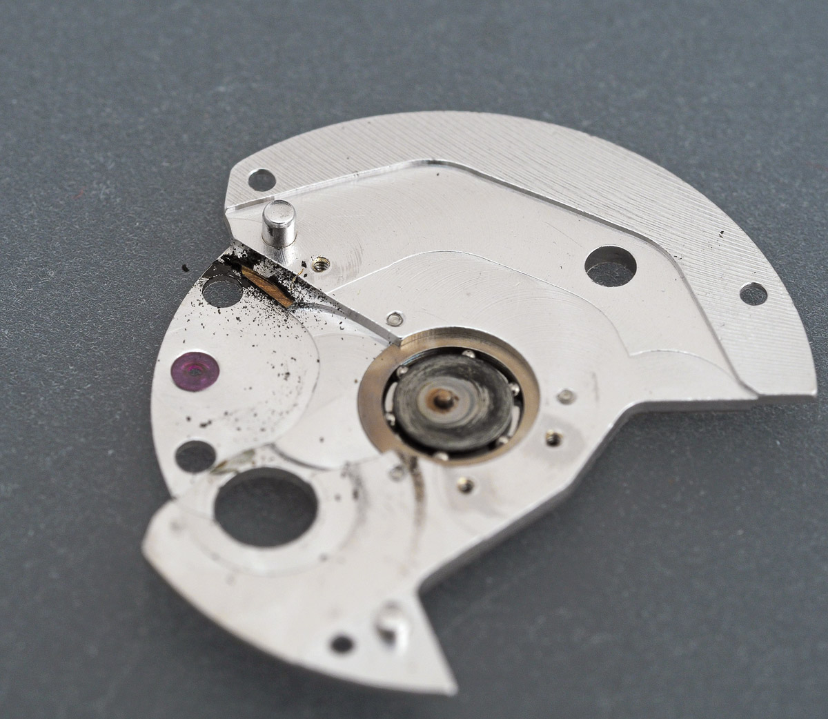 The barrel arbor hole in the bridge is filthy and the barrel surface stained, both testaments to the lack of attention that appears to have been paid to the movement.
