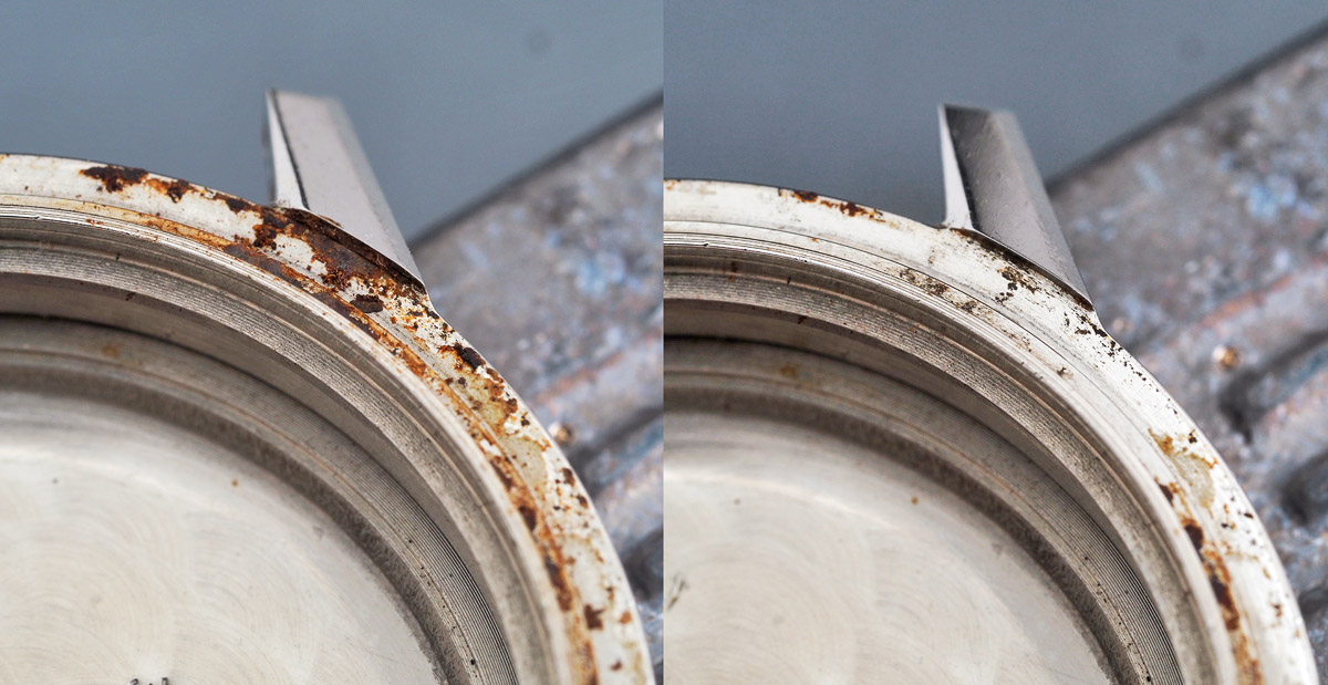 The seemingly generous quantities of hydrated iron oxide present around the mating surface of the case are quite easily removed and the actual extent of corrosive damage to the case revealed to be rather milder than initially suggested.