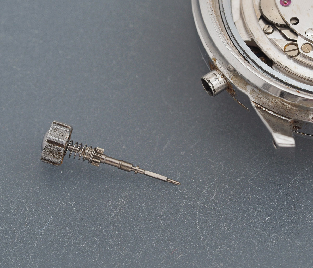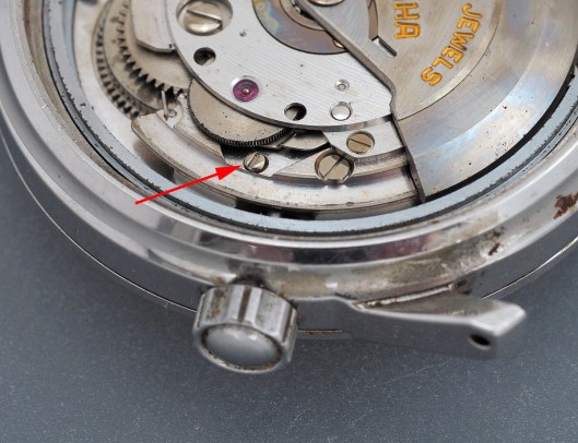 Its successful removal requires that you pull the crown out to the time-setting position and continue to pull gently while turning the setting lever screw anticlockwise until the crown pulls free. Unless you are planning on dismantling the movement, great care is required to ensure that you don’t unscrew it completely from the setting lever. Recovery from such a calamity requires removal of the hands and dial.
