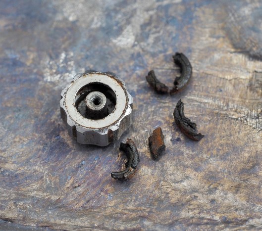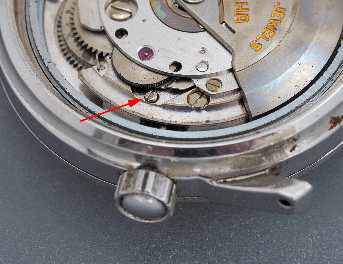 I don’t propose to provide a detailed breakdown of the movement because we’ve been here umpteen times in the past with this basic calibre but I will pause to note the following: where the high level of tarnish and the unblemished condition of the screw heads on the balance side suggest that this movement may not have been serviced in the past, I note that the setting lever spring screw has a slither of metal lying along its groove suggesting a screwdriver slippage. However, it is not clear to me whether the damage to the screw head occurred when the screw was being tightened or loosened. The perfect condition of the hour wheel film washer persuades me that my interventions here may well be the first since it left the Daini factory in 1963.
