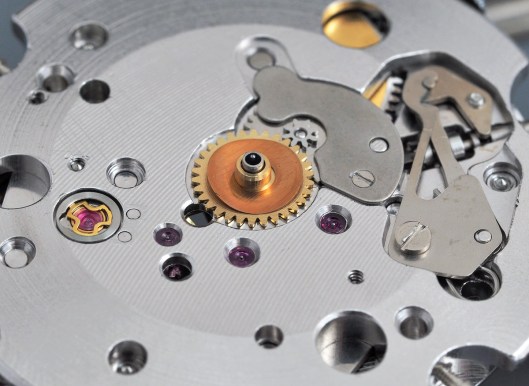 You will notice the gear mounted on the stem, there to mesh with the plastic teeth on the underside of the inner rotating bezel.