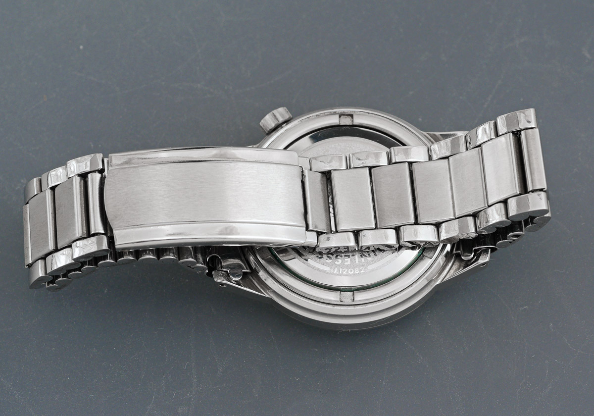 The conundrum we usually face at this point it to identify a suitable strap. These watches would originally have been supplied on a steel bracelet featuring a divers extension on the clasp. The photo below shows a correct original bracelet fitted to my new old stock example.