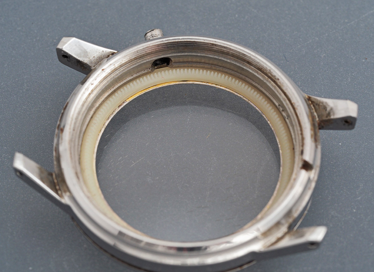 With the crystal removed, we can see that the inner timing bezel just sits loosely within the case aperture. There is no retaining pressure spring present here or in any of the examples of this watch that I have handled. The timing bezel is simply held in place by the crystal. It should be clear in observing the way the bezel meets the case lip that there is simply no room in any case for a retaining spring.