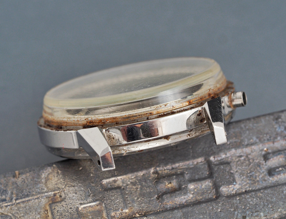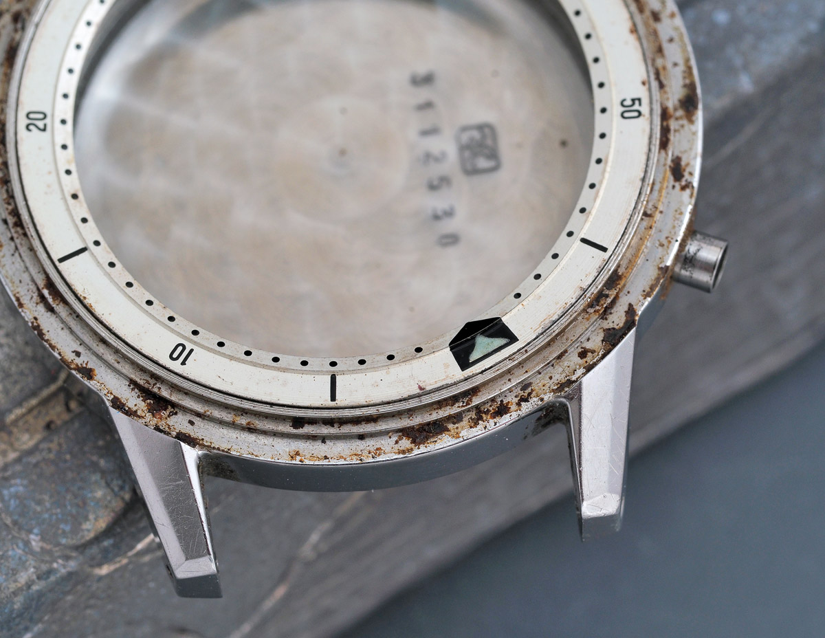 Switching track, the case is really in very nice condition, with that impression only slightly marred in its disassembly by the obvious build-up of external grot and, yes, some corrosion along the mating surfaces of bezel and mid-case. You may recall that the crystal on these watches is of the type that sits around the outside of the case aperture lip, its waterproof seal provided by the external force of the tightly fitting external bezel.