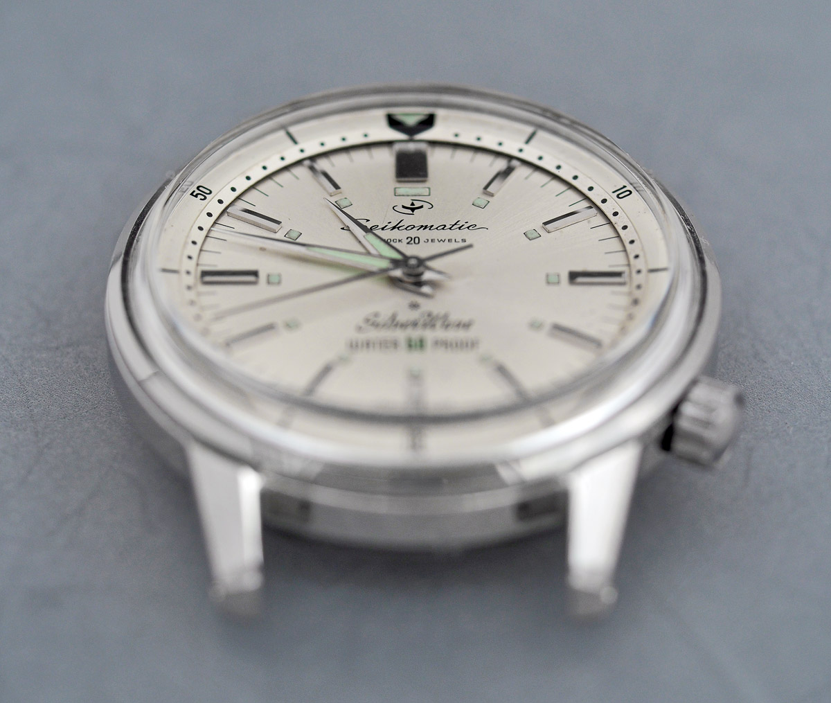 Paradoxically, the year 1963 can simultaneously provide a historical reference point to the development of the quartz watch movement and its role in the white heat of technology revolution whilst also providing a stopping point in the somewhat more steady application of traditional horological technologies to the development of the diver’s watch. In some sense, this period feels a little like the turn of the last century must have in the world of physics: Newtonian mechanics was in no danger of imminent obsolescence but it was having to contend with the radical new ideas of Planck, Einstein, Rutherford and Bohr. In the context of the current upheavals the world is experiencing and in particular those of us living in the UK and Europe, it worth noting that in January of 1963, Charles De Gaulle, demonstrating a razor-sharp prescience, vetoed the UK’s entry into the European Economic Community. At that time, I was not yet even a twinkle in my father’s eye, although the plotting I am sure was underway. January 1963 was also notable for marking the production date of the silver-dialed Seikomatic SilverWave sports diver pictured below.